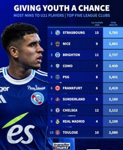 五大联赛U21出场时间排行:斯特拉斯堡5785分钟居首